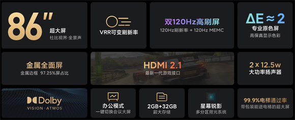 Redmi MAX 86”智能电视采用了86英寸120Hz 高刷全面屏,支持120Hz MEMC 硬件级运动补偿,配备多分区背光系统;支持4K画面、ALLM 自动低延迟模式以及动态;达到了DCI-P3 92%广色域覆盖范围,拥有10bit专业级色深,10.7亿色,能够精准、细腻还原大自然绮丽光影,色彩准确度达到dE 2,媲美专业级显示器。