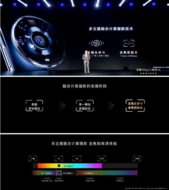 随着手机影像快速发展,受限于手机自身空间较小,影像硬件提升空间受到诸多束缚,因此融合计算摄影逐渐成为当下智能手机影像发展趋势。截至目前,虽然融合计算影像已经历单摄多帧融合算法、单一焦段多摄多帧融合计算影像两代发展,但是仍未充分释放多摄像头以及融合算法的真实实力。基于这一困局,荣耀Magic3系列在行业内首次做到全镜头参与,全焦段融合的计算摄影,在广角焦段,采用了彩色主摄和超广角摄像头的融合;在1x(高清像素下),使用了彩色主摄和黑白摄像头融合;在长焦以下焦段,根据效果智能使用彩色主摄和长焦融合策略,长焦镜头使用了多帧融合,让用户最终实现全场景的高清拍摄体验。