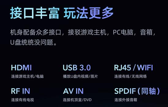 G65ES电视的接口也非常丰富,支持HDMI、USB、RF IN、AV IN、 RJ45/Wi-Fi 、Audio out,可连接机顶盒、外接音箱或者游戏主机、游戏手柄等,满足不同场景下的用户使用需要。