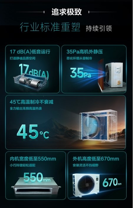具备自感知、自调节、自适应、一体联控等智能特质的“5G空气管家”海信5G+荣耀家,以能效高达APF值6.10的单风扇机型扩充了阵营,在性能与智能化方面进行了进一步提升,45℃制冷不衰减无惧热浪;荣耀家Ⅱ代,依托全新技术升级,降低噪音,全面抑菌,在“净”与“静”等领域全面达成更高境界;风范家Ⅱ代,全面强化软硬件,43℃制冷不衰减,-20℃制热无惧低温,室内机更以17dB(A)轻音运行与550mm宽度全面引领行业之先;嵌入式厨房专用室内机,全域防油烟,高效制冷。再加上以高度定制化、极具设计感的私享家系列满足高端消费群体需求,以新风室内机打造“空、净、氧”三合一解决方案,经过升级与扩充的海信中央空调产品矩阵,将能根据用户的需求和室内外环境的变化,通过AI技术实现主动学习和思考,凭借先进5G技术加持实现更稳定的远程与语音操控,为不同气候的地域打造“全气候空气解决方案”,为不同人口结构的家庭打造“全空间空气解决方案”,为不同用途的场景营造“全场景解决方案”,实现对“5G全域健康空气解决方案”需求的全面覆盖。